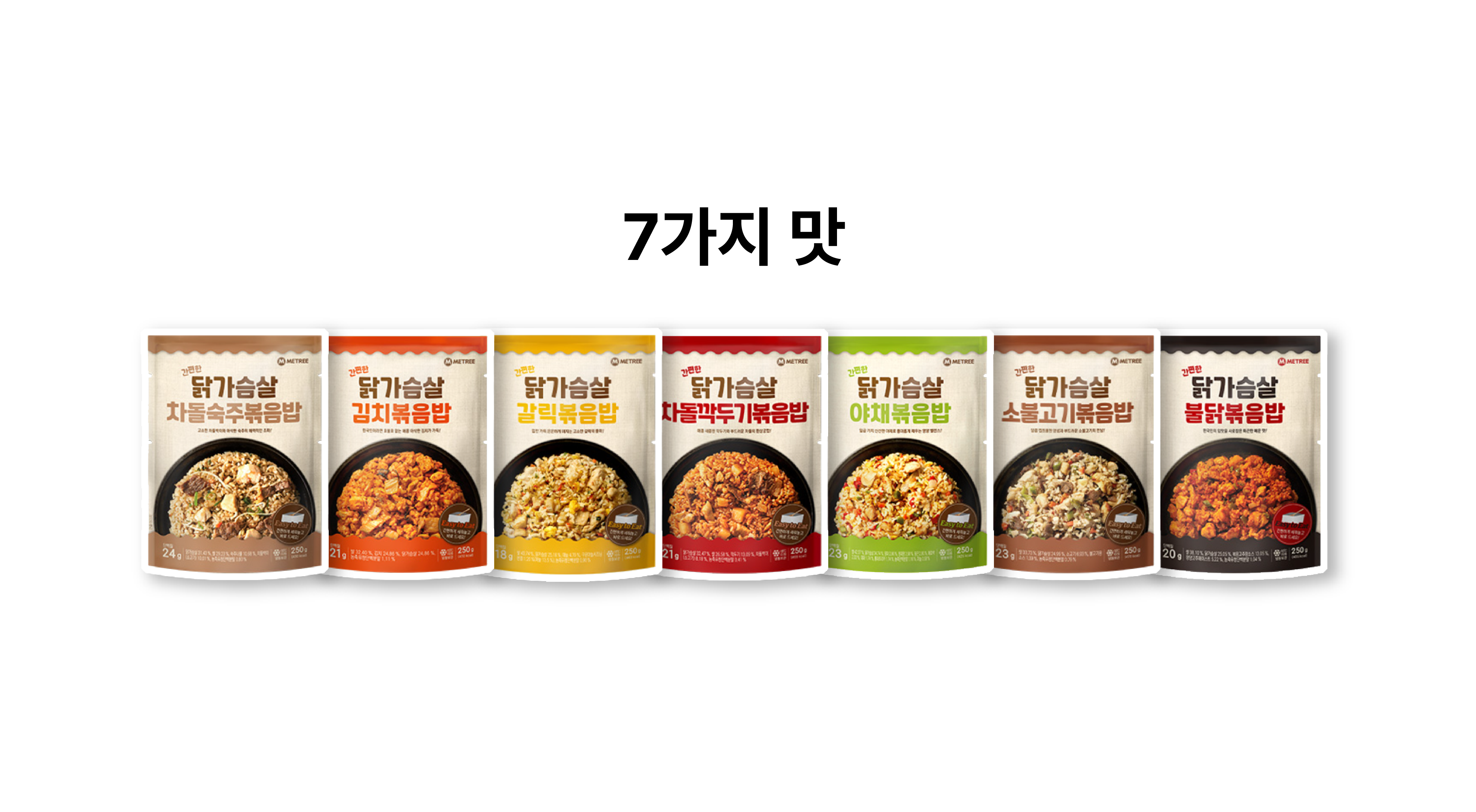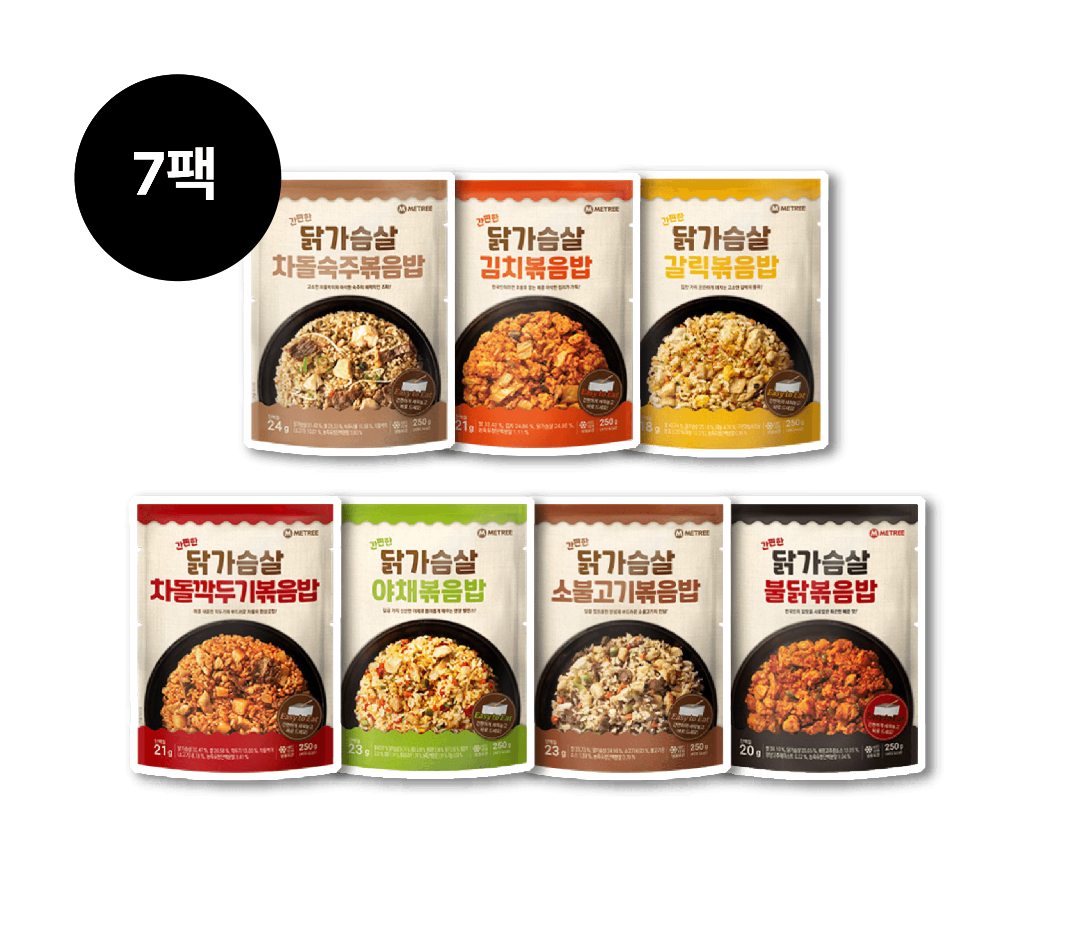 ๐๊ฐํธํ ๋ณถ์๋ฐฅ 7ํฉ SET ๊ฐํธํ ๋ญ๊ฐ์ด์ด ๋ณถ์๋ฐฅ 250g ๊ฐ๋ฆญ1, ๊น์น1, ์ผ์ฑ1, ๋ถ๋ญ1, ์๋ถ๊ณ ๊ธฐ1, ์ฐจ๋์์ฃผ1, ์ฐจ๋๊น๋๊ธฐ1